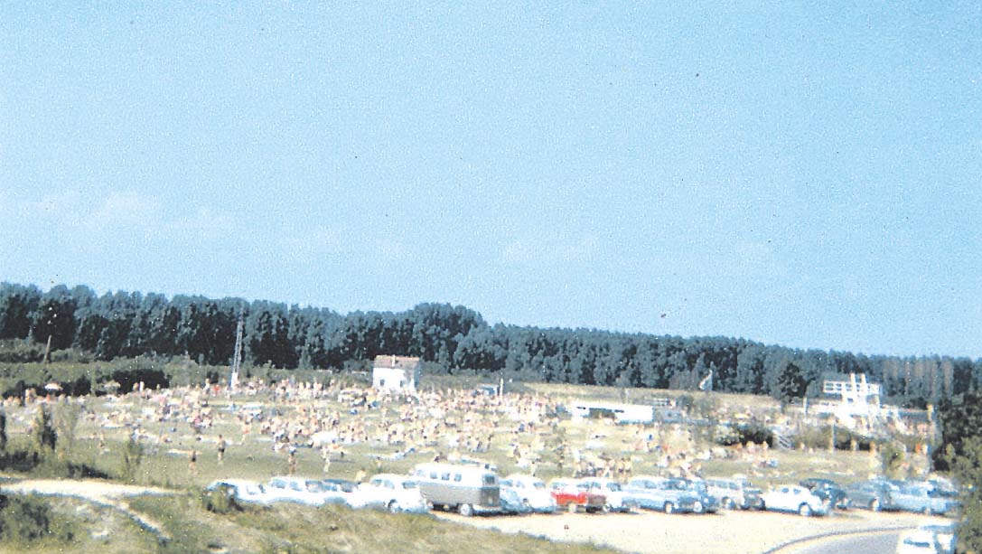 Auf dem Bild: Stilleben mit Bulli, Käfer und Rekord: Impression aus den Anfangstagen des Stockstädter Freibads in den 1960er Jahren. Hier noch ohne Schattenspender.